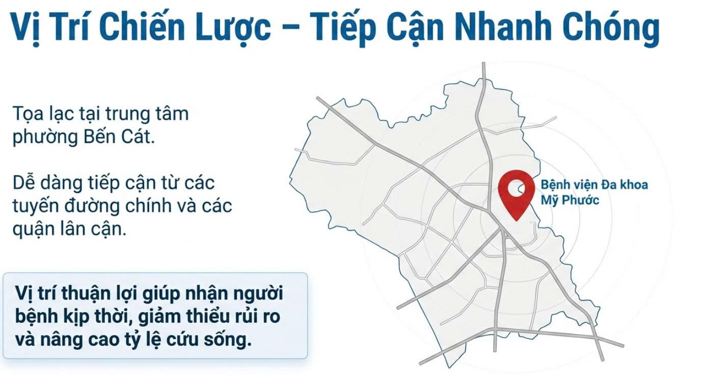 Bệnh viện Đa khoa Mỹ Phước là cơ sở y tế đa khoa uy tín tại khu vực, với đội ngũ y bác sĩ chuyên môn cao, hệ thống cấp cứu hoạt động 24/24, sẵn sàng đồng hành cùng doanh nghiệp trong mọi tình huống khẩn cấp.